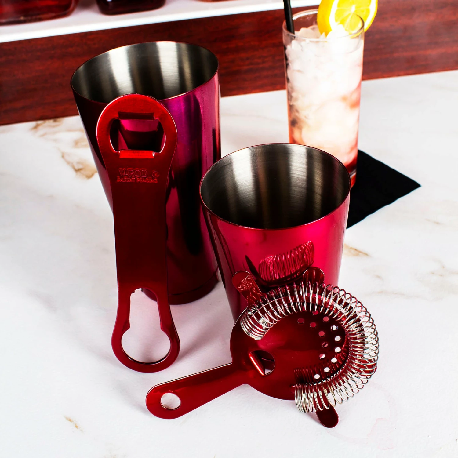 These 4 piece bar sets are specially equipped with everything you need when making delicious cocktails. Each set includes a 28 ounce and 18 ounce shaker tin, a 4 prong strainer, and a V-Rod® opener. This set not only can get you started, but it also makes the perfect gift for your bartending friends. Each set is made of durable stainless steel and has a bright reflective color making each set stand out in your bar.