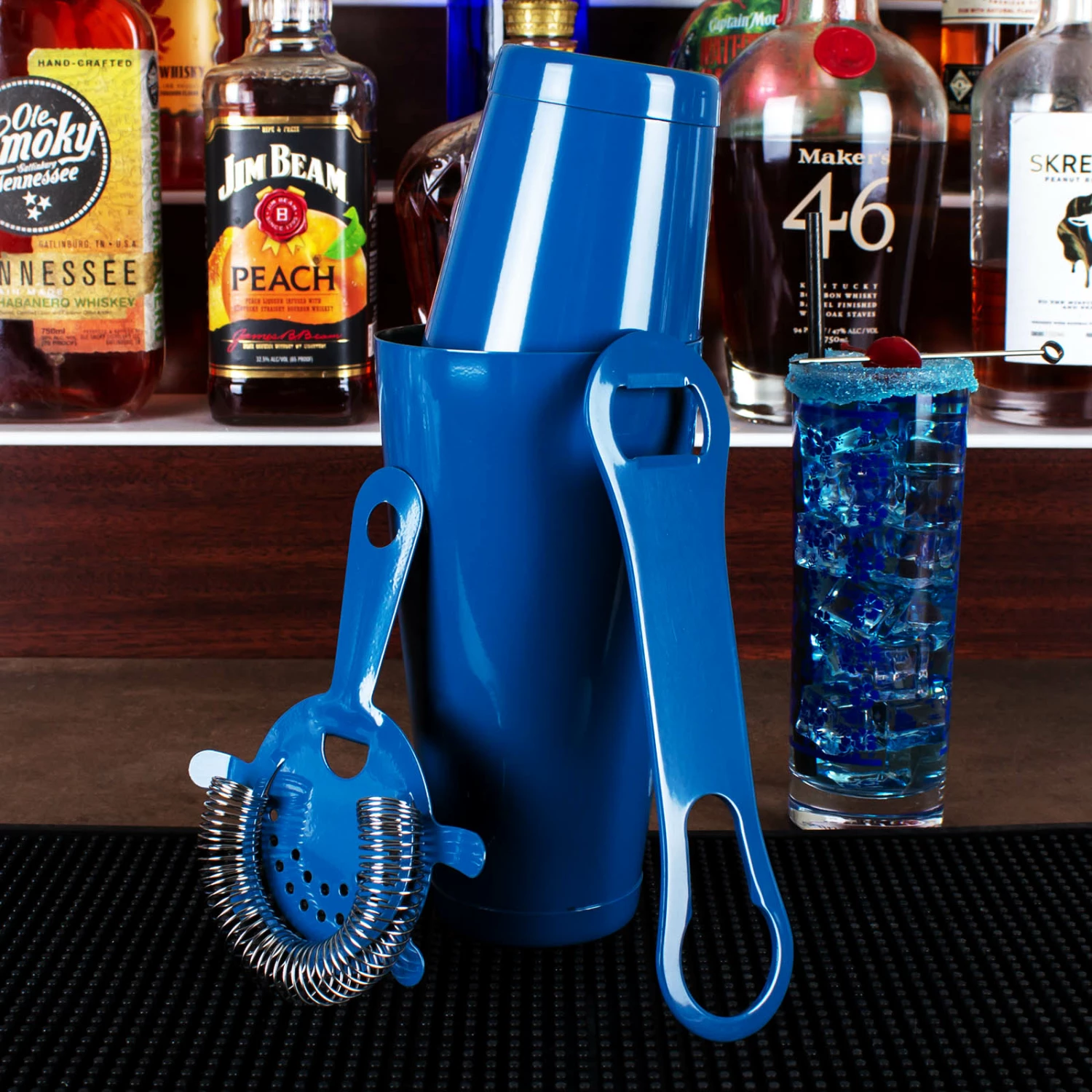 This 4 piece Azure Blue Bar Set is equipped with everything you need when making cocktails your guests. It includes a 28 ounce and 18 ounce shaker tin, a 4 prong strainer, and a V-Rod® opener. Not only can this set get you started, but it also makes the perfect gift for your bartending friends. It is made of durable stainless steel and has a bright reflective color making it stand out in your bar.