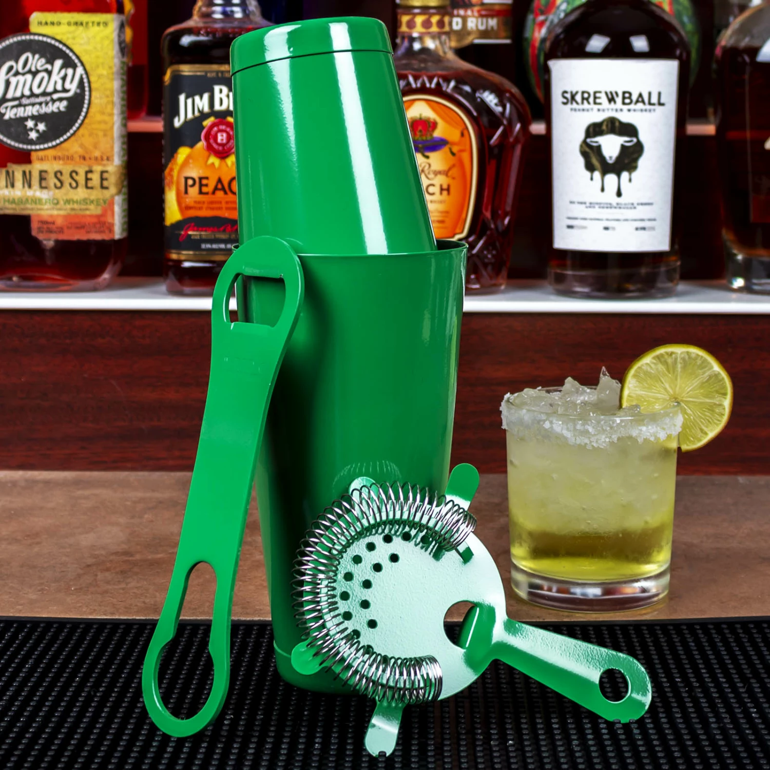 This 4 piece bar set is equipped with everything you need when making delicious cocktails. Set includes a 28 ounce and 18 ounce shaker tin, a 4 prong strainer, and a V-Rod® opener. This set not only can get you started, but it also makes the perfect gift for your bartending friends. It is made of durable stainless steel and has a bright reflective color making it stand out in your bar.