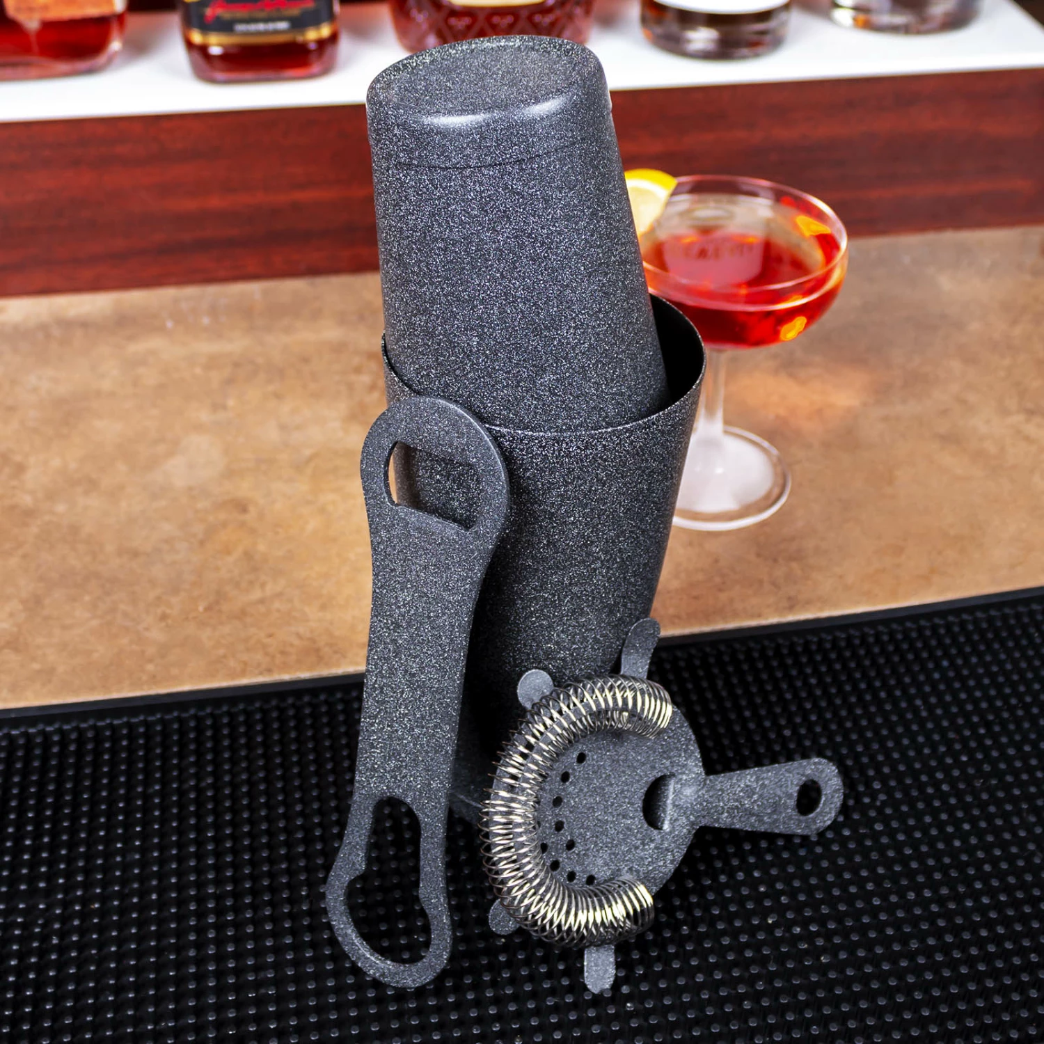 This 4 piece bar set is equipped with everything you need when making delicious cocktails. Set includes a 28 ounce and 18 ounce shaker tin, a 4 prong strainer, and a V-Rod® opener. This set not only can get you started, but it also makes the perfect gift for your bartending friends. This set is made of durable stainless steel and has a matte surface, making it stand out in your bar from the rest.