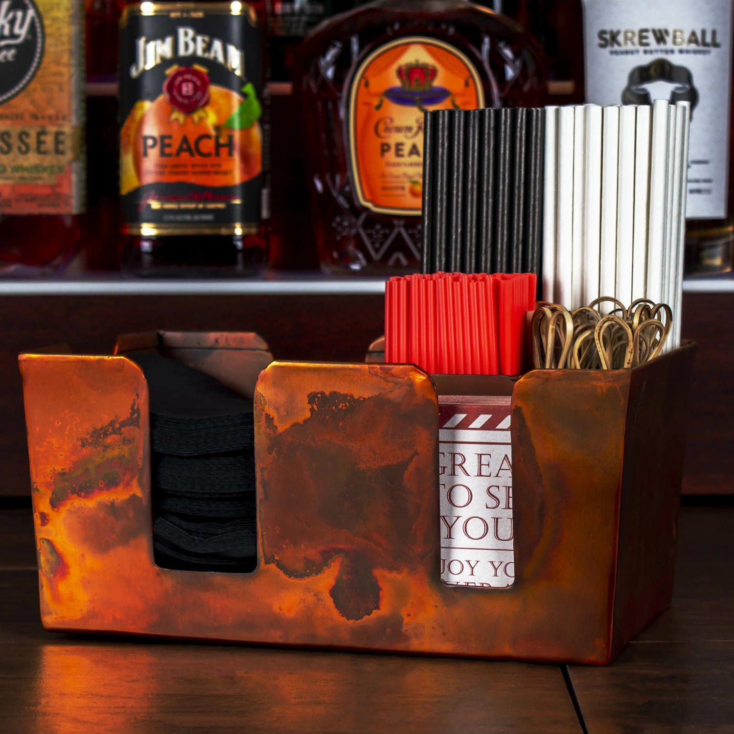 This bar caddy allows you to keep napkins, spoons, straws, sugar packets, and condiments organized. It has a unique antique copper finish that is sure to impress your guest. It is divided into a total of 6 compartments of various sizes. This caddy is 9″ x 6″ and is 4″ high and is perfect for bars or restaurants!