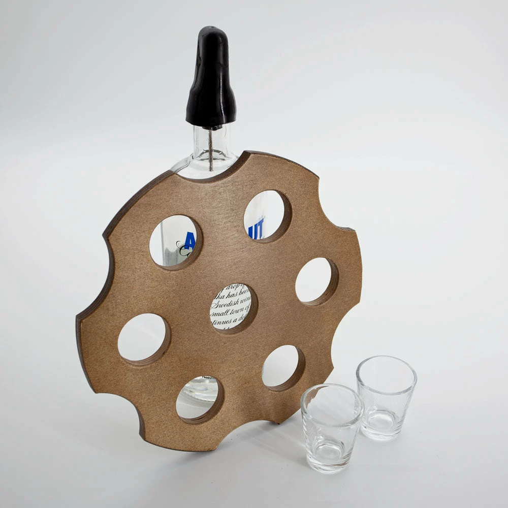 Elevate your party presentation! Attract attention as you deliver table service at the nightclub, or impress your friends and family in VIP style when hosting your own parties. Our 6-shot holder measures 0.5in thick, just under 10in diameter, and has a hole size of 1.65” diameter. It weighs 0.6lbs and is available in black, dark walnut stain, or a variety of printed options. This bottle topper is manufactured in our USA-based woodshop, where we focus on quality and attention to detail.