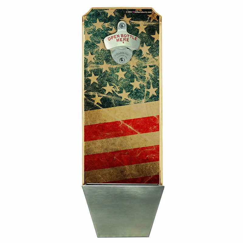 Are you proud to be an American? If so, this wall mounted bottle opener will look great in your bar or home. A grungy design paired up with the coloring and grain of the wood makes for a very cool and rustic look to this American Flag. Handmade in the USA, this wood plaque is very durable and quality constructed. It features 2 pre drilled holes for easy wall mounting. It comes already assembled with a cast iron Bottle Opener and stainless steel Cap Catcher that conveniently detaches for easy cap clean up.