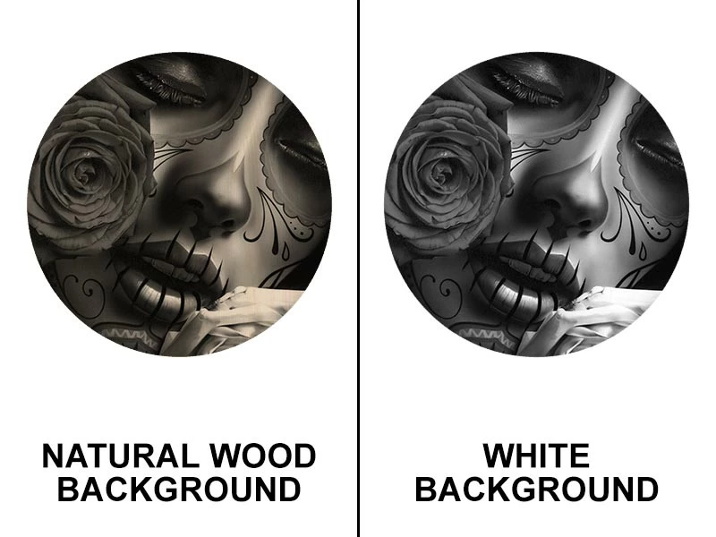 Available in either a Natural Wood background or a White background. The texture of the wood shines in the Natural Wood option, while the whites from the art are more vivid with the White option.