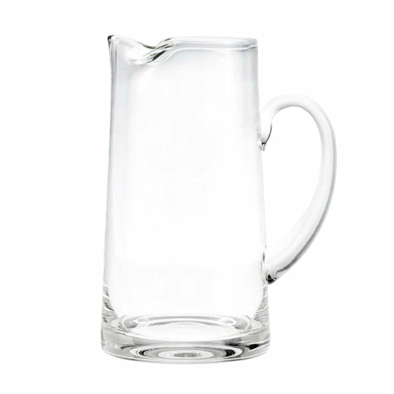 Glass Artisan pitcher with a classic design, holds up to 70 oz. of liquids. With a large handle for easy pick-up and set-down, you can easily move it to different areas in your home to entertain. From the pool side or just in the kitchen you can show off your beautiful concoctions in this clear high-quality glass pitcher. Measures 9 ½” Tall x 5” Base.