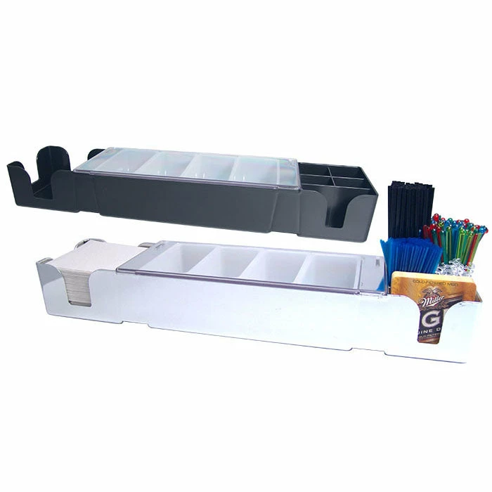 This Bar center holds approx. 300 napkins, and a wide assortment of picks, straws, stirrers, and coasters. Approx. 2 ft wide, 5.5″ deep, and 3.5″ tall. The Bar Center does not come with items pictured below. When ordering in quantity, multiples of 4 are appreciated.