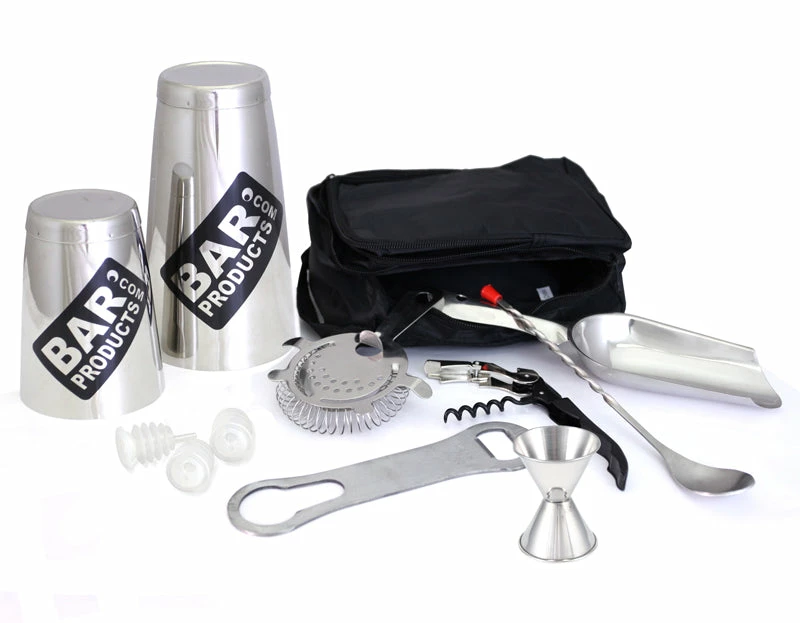 Bar Products Tote Bags are the perfect gift for any bartender! They come complete with all the tools you need to make delicious cocktails anywhere. This set features either Neon or Regular Stainless Steel Weighted Cocktail Shaker tins with the Barproducts.com logo and a matching V-Rod® Bottle Opener. Plus it was even featured in a video by internet sensation Tipsy Bartender!