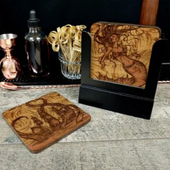 Wooden Coasters – Mythological Creatures – Set Of 4 W/ Coaster Caddy
