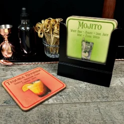 Wooden Coasters – Cocktails Design – Set Of 4 W/ Coaster Caddy