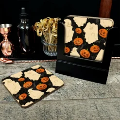 Wooden Coasters – Trick Or Treat – Set Of 4 W/ Coaster Caddy
