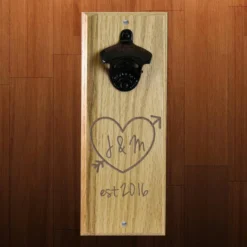 Engraved Tree Heart Wooden Wall Bottle Opener W/ Magnetic Cap Catcher