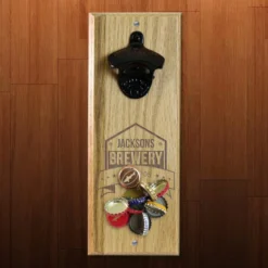 Engraved Brewery Wooden Wall Bottle Opener W/ Magnetic Cap Catcher