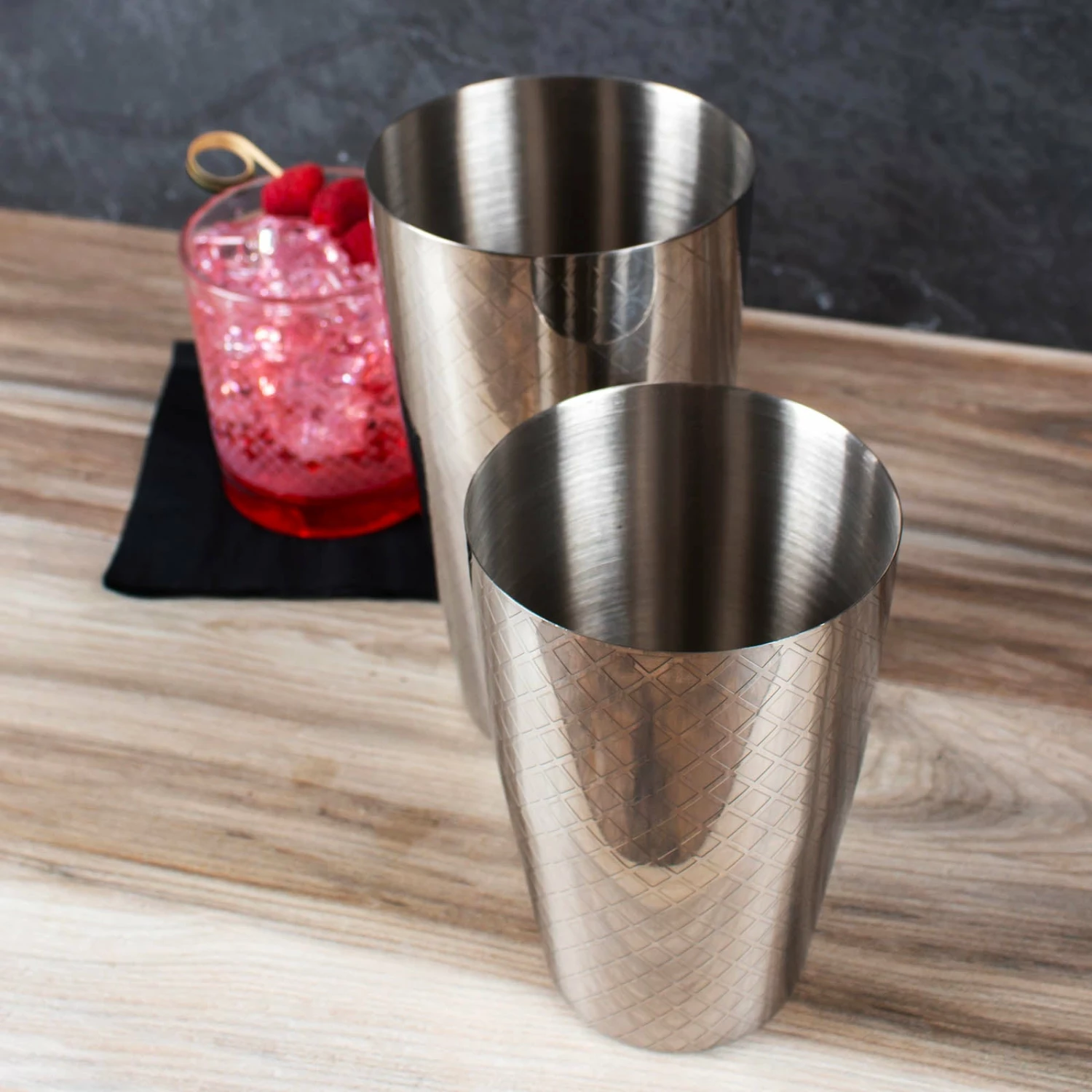 This beautiful 2 piece shaker set is a must have for your bar. It comes with 2 stainless steel shaker tins that feature a diamond shaped pattern all around the tins. The largest tin measures 6.75″ tall and has a liquid capacity of 28 ounces. The smallest tin measures 5.5″ tall and has a liquid capacity of 18 ounces. This set also makes a perfect gift for a wedding, housewarming, or host gift.