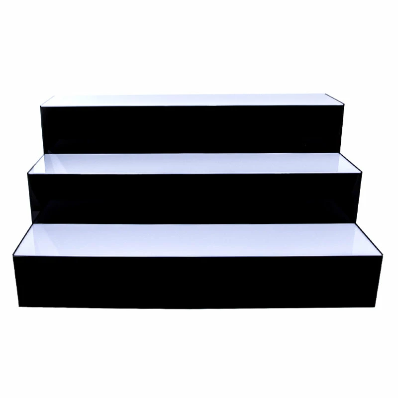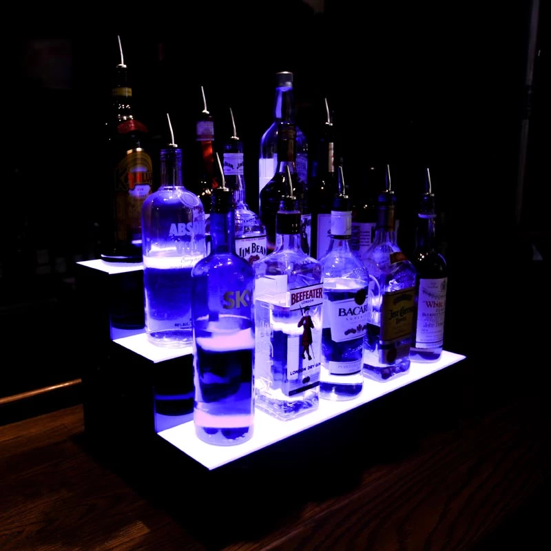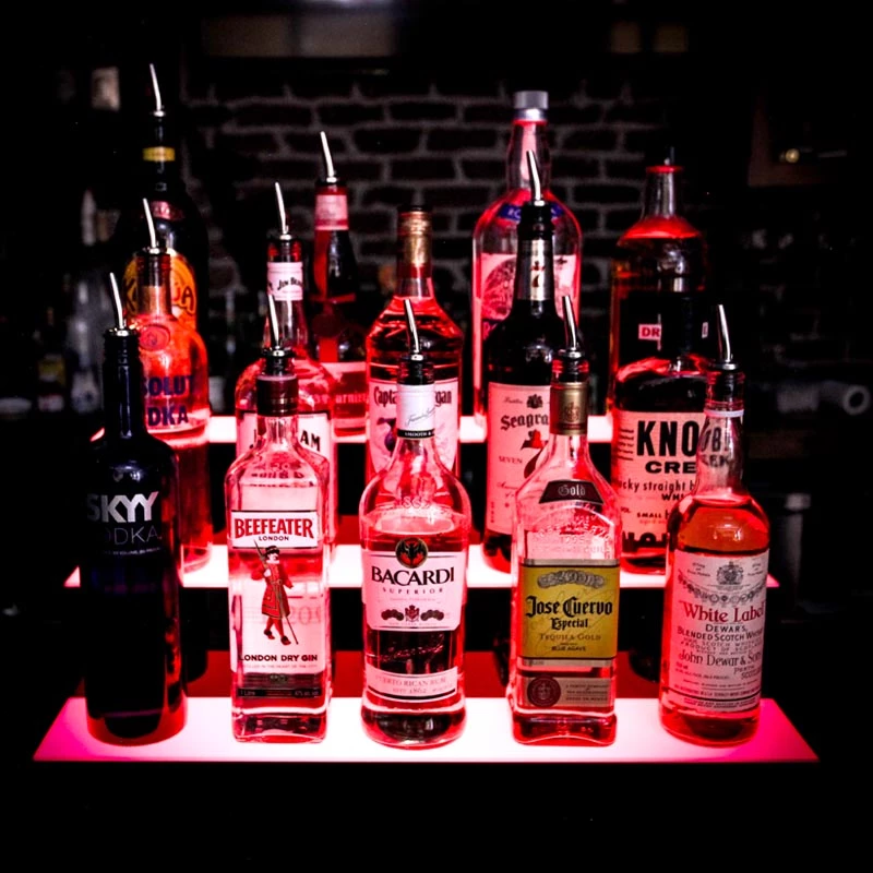 BarConic® LED acrylic liquor bottle display 3 tier shelves are a great way to showcase your different types of liquor brands. It grabs the attention of your guests while creating a fun ambiance to your bar. The shelves come with a handy wireless remote control that will allow you to create an unlimited range of color choices and create the right mood for any atmosphere. The design of this shelf plus the long lasting LEDs and durable acrylic construction make this shelf a must-have for your bar. Standard 12 volt UL Approved Power. Choose the size that’s right for your bar, we have 18” to 48” long shelves.