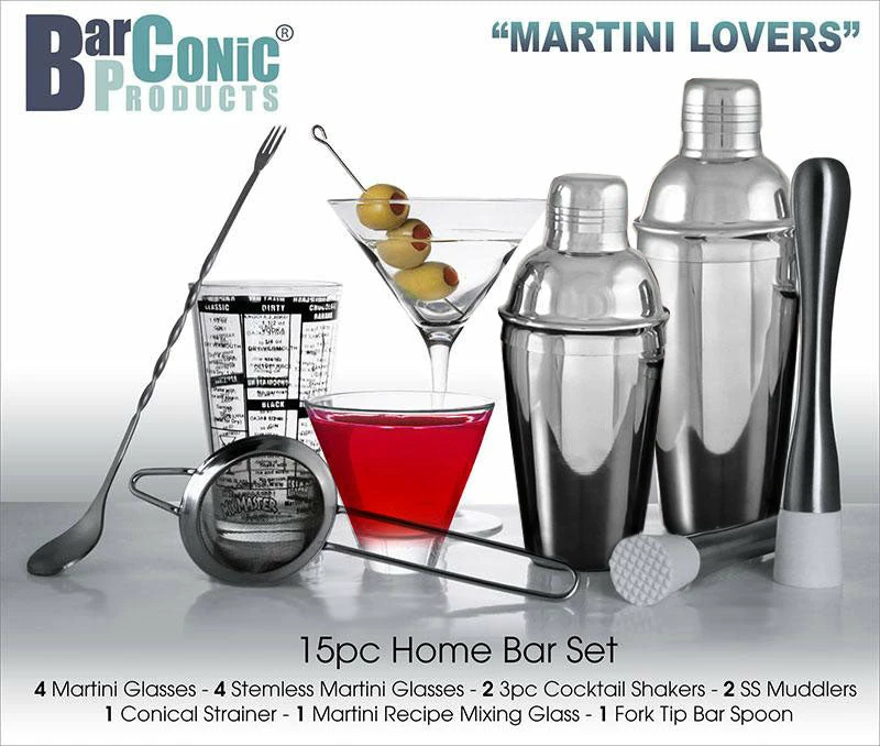 If you, or someone you know, loves the art of creating the perfect Martini, then consider this BarConic® Martini Bar Set a “must have”. It features 15 bar tools that will allow you to host the best Martini Party on the block. Martini drink recipes are all the hype these days, so invite your friends, neighbors and family to enjoy an evening of experimentation and laughter.