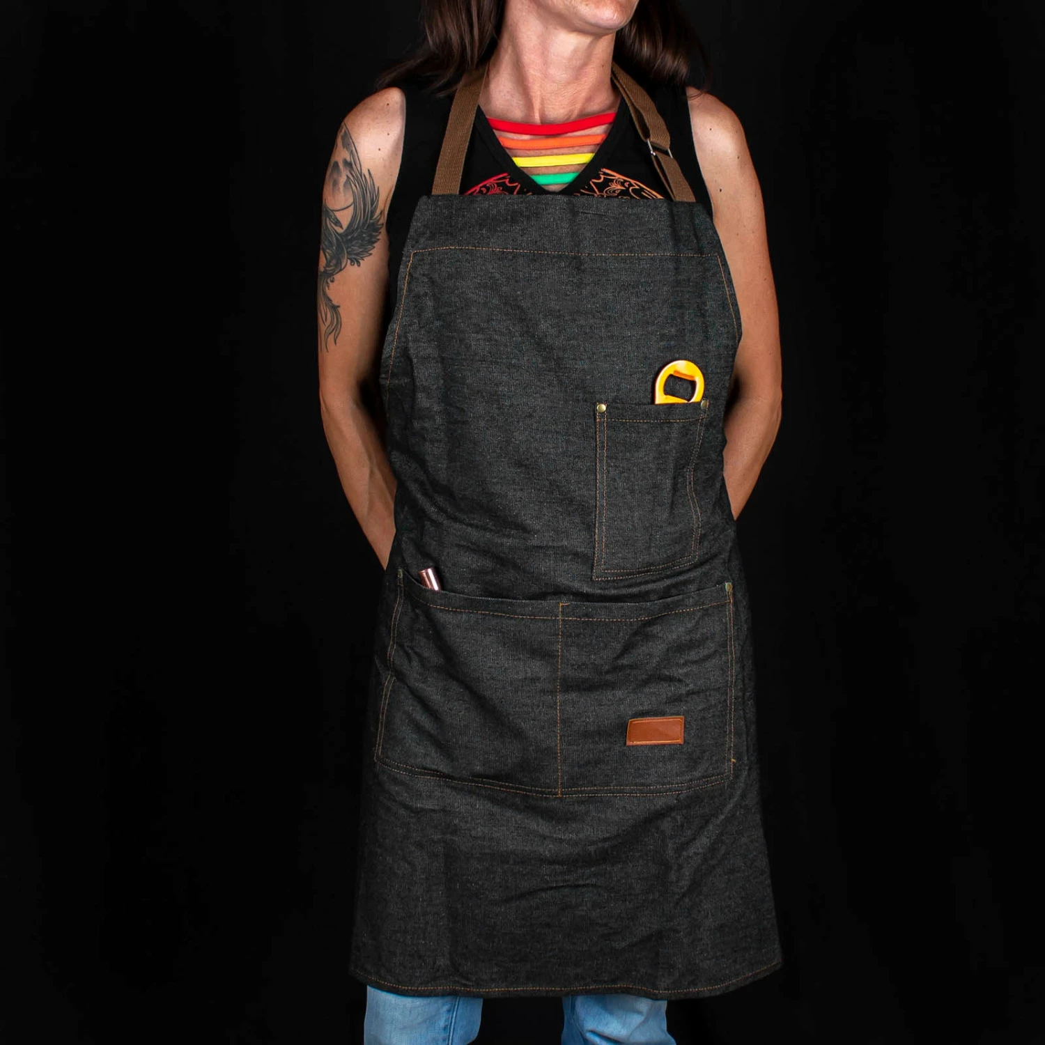 This black denim apron is a must have for any restaurant worker or bartender. stylish and durable, This apron is Made of 100% cotton and is very lightweight. It features 3 various sized pockets so you can hold multiple items such as barware equipment or check pads and pens. It also comes with adjustable straps that keep the apron secure and snug preventing it from shifting around while you work. This apron measures 30″ in length and 27.5″ in width