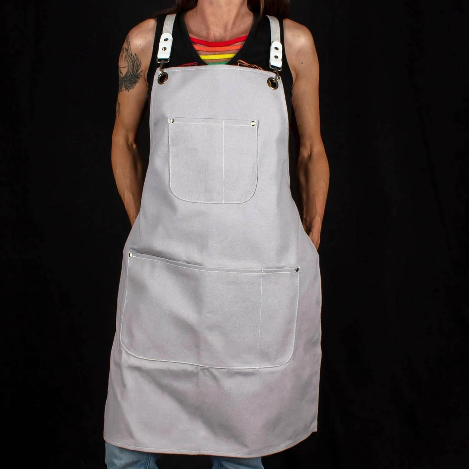 This gray canvas apron is a must have for any restaurant worker or bartender. Made of 100% cotton, This apron is very durable yet very lightweight. It features 4 various sized pockets so you can hold multiple items such as barware equipment or check pads and pens. It also comes with adjustable straps that keep the apron secure and snug preventing it from shifting around while you work. This apron measures 30.75″ in length and 24″ in width