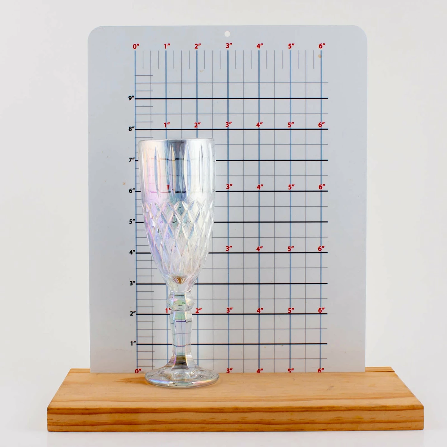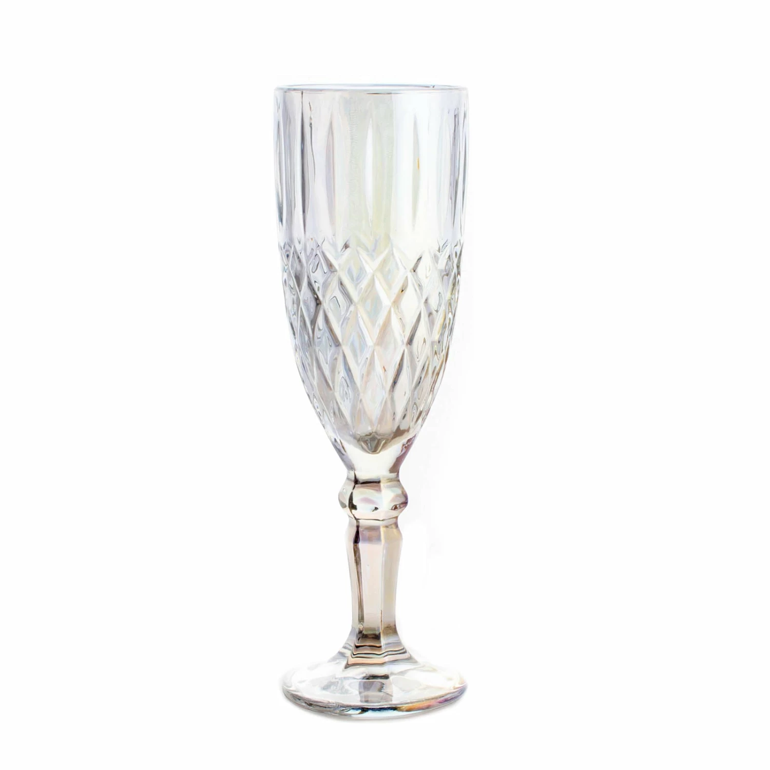 This Iridescent Diamond Pattern Flute is a must have for your home or professional bar. It is made of durable thick glass and has a crystal clear brilliance with a light shade of metallic colors. This glass has embossed diamond shaped patterns along the bottom of the glass and an embossed vertical line pattern along the top of the glass. Measures 7.5″ in height with a rim diameter of 2″. Has a max liquid capacity of 5.5 ounces. This glass is only available in a box of 6 or a case of 24.