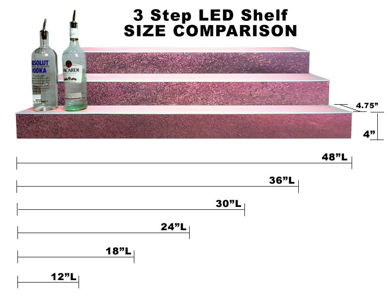 LED Liquor Bottle Display Shelves are a great way to showcase your different types of liquor brands. It grabs the attention of your guests while creating a fun ambiance decor to your bar. These 3 step (tier) shelves are manufactured right here in our USA Woodshop. Each shelf showcases a high quality craftsmanship that is durable and built to last at an unbeatable price.