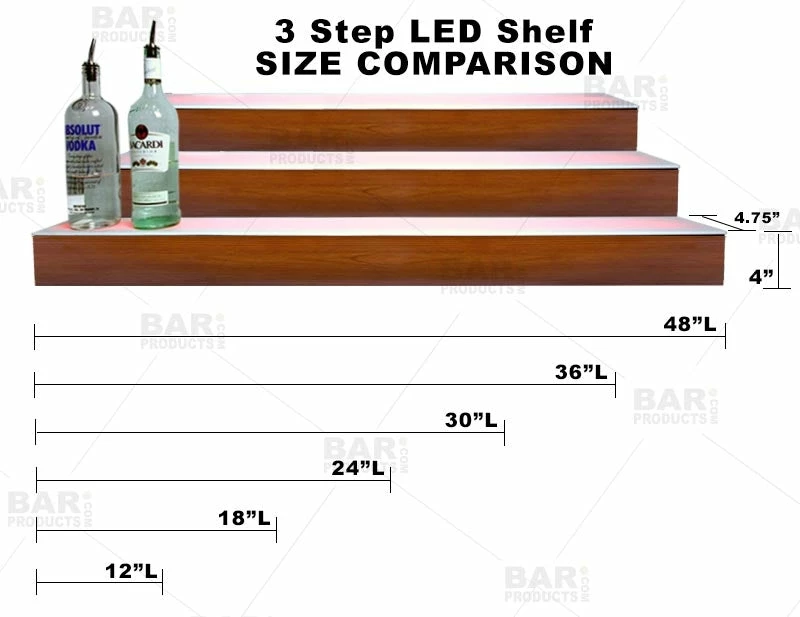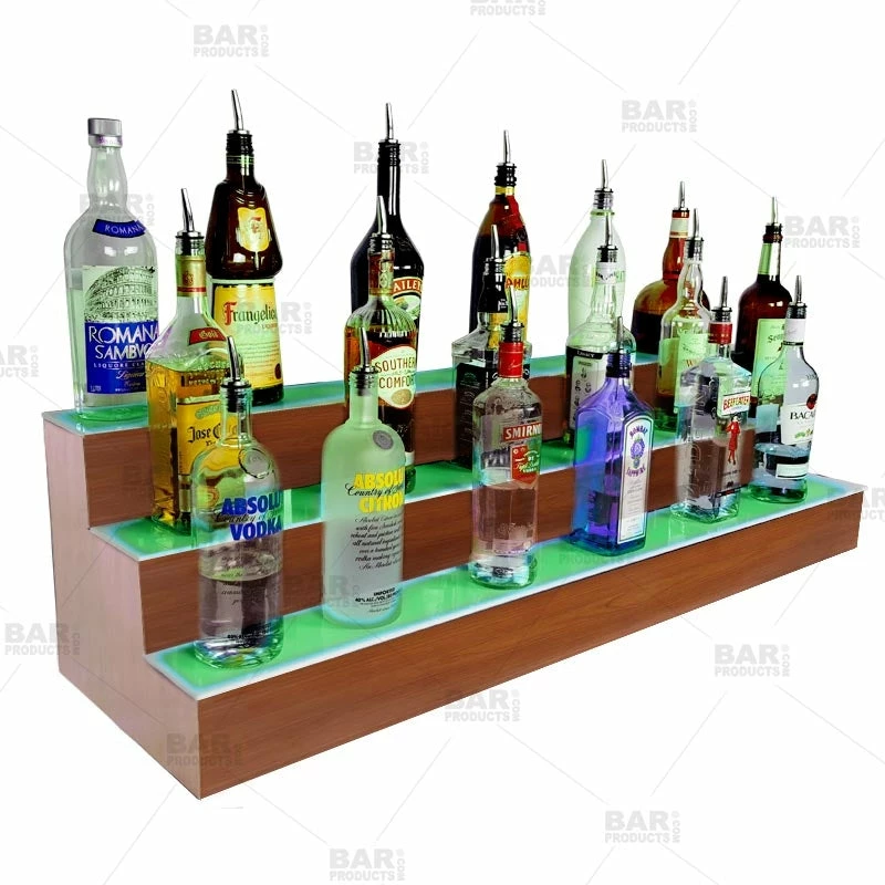 LED Liquor Bottle Display Shelves are a great way to showcase your different types of liquor brands. It grabs the attention of your guests while creating a fun ambiance decor to your bar. These 3 step (tier) shelves are manufactured right here in our USA Woodshop. Each shelf showcases a high quality craftsmanship that is durable and built to last at an unbeatable price.