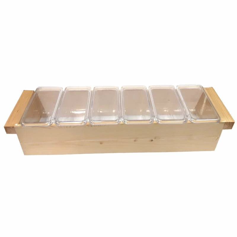 Looking for an economical way to set up your bar? Try these quality BarConic® natural wood condiment holders (a.k.a. fruit trays). These wood condiment holders are perfect for storing all your cocktail garnishes and keeping them fresh. They’re easy to clean with removable transparent pint containers with slide-on lids. Condiment holders like these are a necessary part of any bartending operation. These smaller sizes are great for bars that don’t have the room for the larger sized condiment holders. They come in 4 or 6 pint compartment sizes.