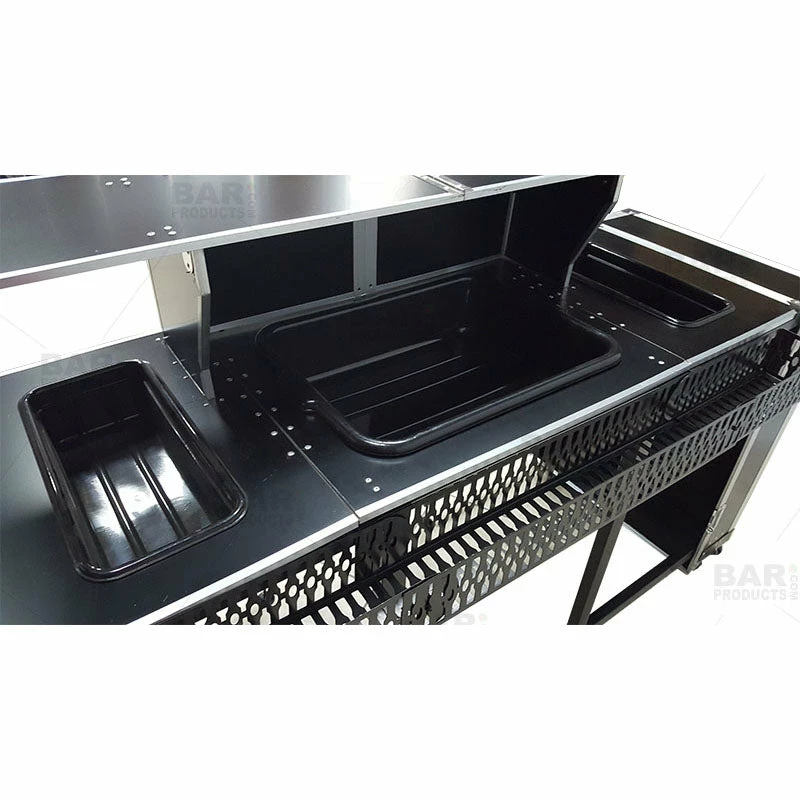 It stands sturdy and strong, providing a professional bar service when in use. It offers every bar set up feature any type of bartender could wish for. The long speed rail will hold several bottles, enabling you to have a large selection of liquor at hand. There is plenty of space for condiments (holders), bitters bottles, mixers, glassware and even cutting boards without cluttering up your work area. The center on the bar holds a large ice bin and either side offers slots for any other type of stock you wish. Disassembling this bar is as easy as setting it up. When you are finished with your bar service it easily breaks down and securely clasps shut ready to be moved onto your next event.