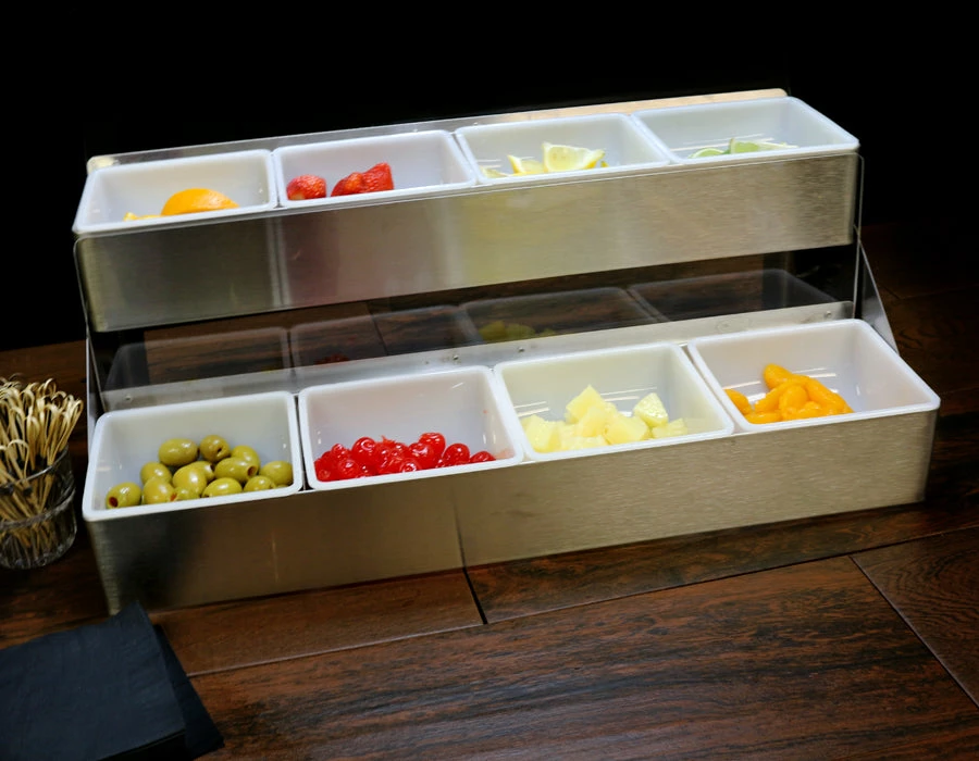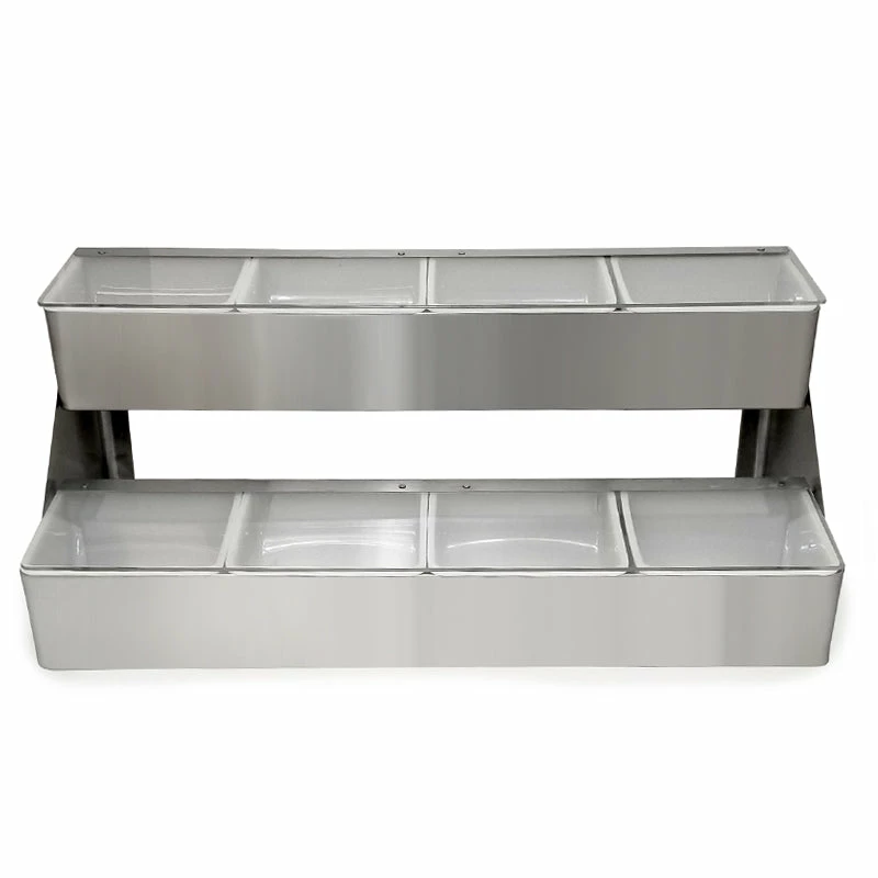 BarConic® This sleek stainless steel double layer quart garnish holder will give your bar top the space you need to craft beautiful cocktails with ease. Garnish Condiment Holders are perfect for storing all of your cocktail garnishes or providing a perfect space to present lemons, limes, olives, cherries, and more. This modern double stacker design allows for more space to display 8 different quart sized options.