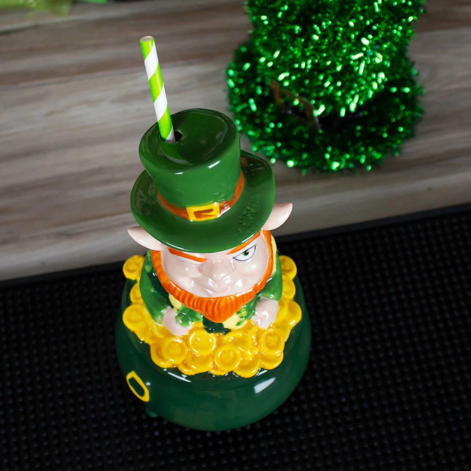 This exclusive BarConic® Tiki Drinkware mug is the perfect elegance to welcome in St. Patrick’s Day. Crafted with an intricate leprechaun design, this tiki mug is sure to stand out from the rest. It is made of durable ceramic and painted with bright beautiful colors. It is the ideal vessel for many different cocktail creations or to simply relish in your favorite beverage. The hat is removable for easy filling and includes a straw hole insert. The base also has 3 individual legs so it sits sturdy on any surface. With a tasteful tiki design, this mug adds a perfect touch of sophistication to any gathering. This mug has a overall measurement of 8.25″ in height with a rim diameter of 1.75″. Has a liquid capacity of 23 ounces.