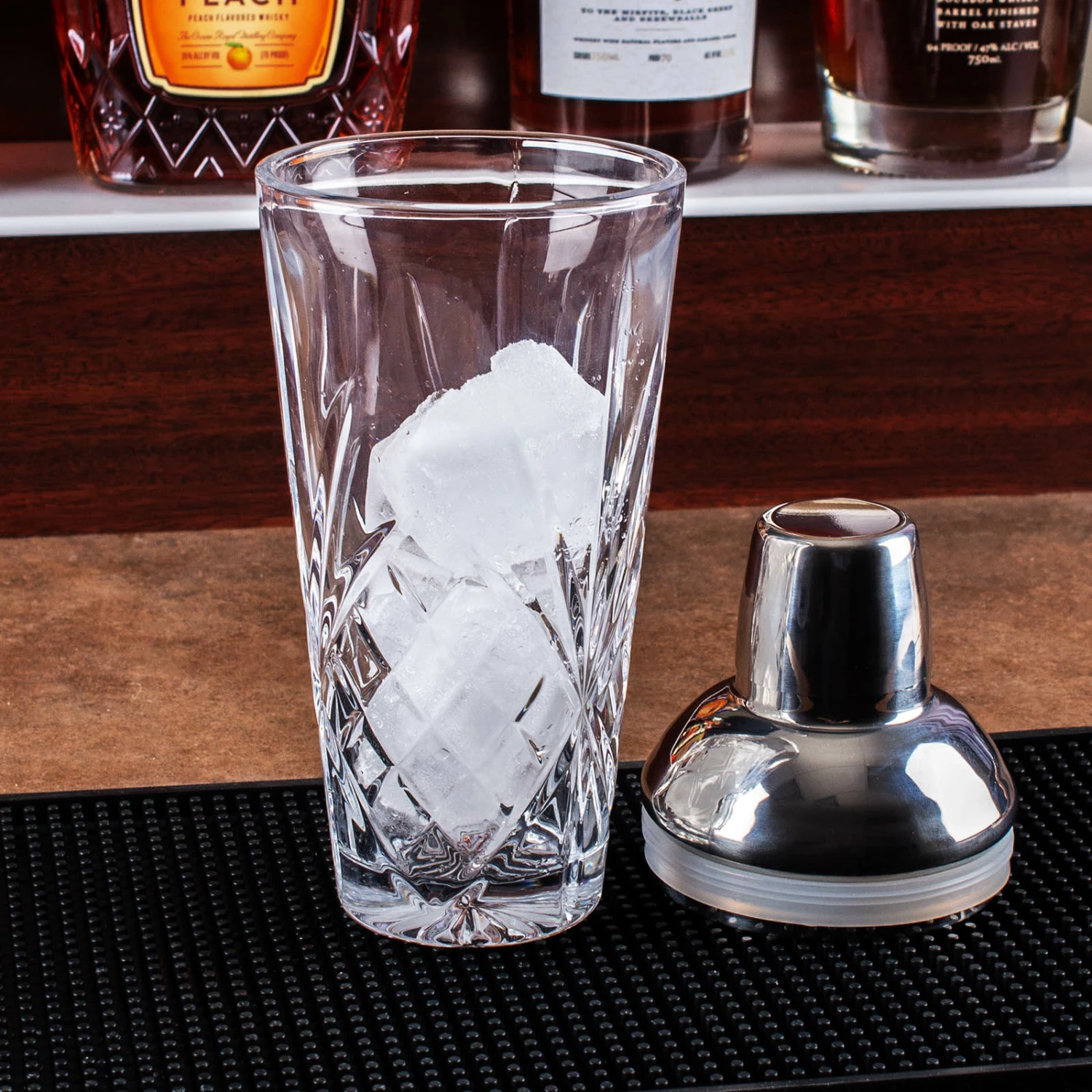 This vintage style cocktail shaker will impress anyone you’re making drinks for. This elegant shaker is made of heavy durable glass that has a crystal like brilliance. It has a beautiful embossed diamond pattern that wraps all around the glass. This shaker comes with a durable stainless steel cap and has a silicone ring making sure you have a tight fit to prevent any spillage. Shaker measures 10 inches in height and has a rim diameter of 3.5″. Has a liquid capacity of 20 ounces.