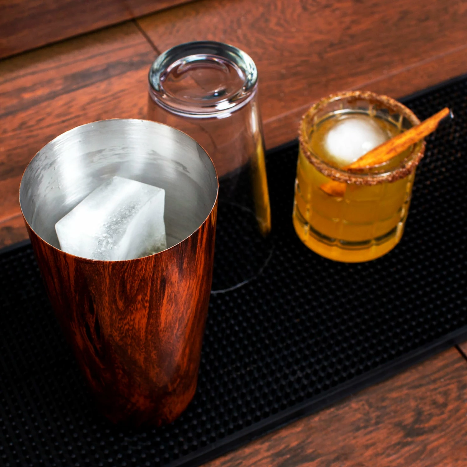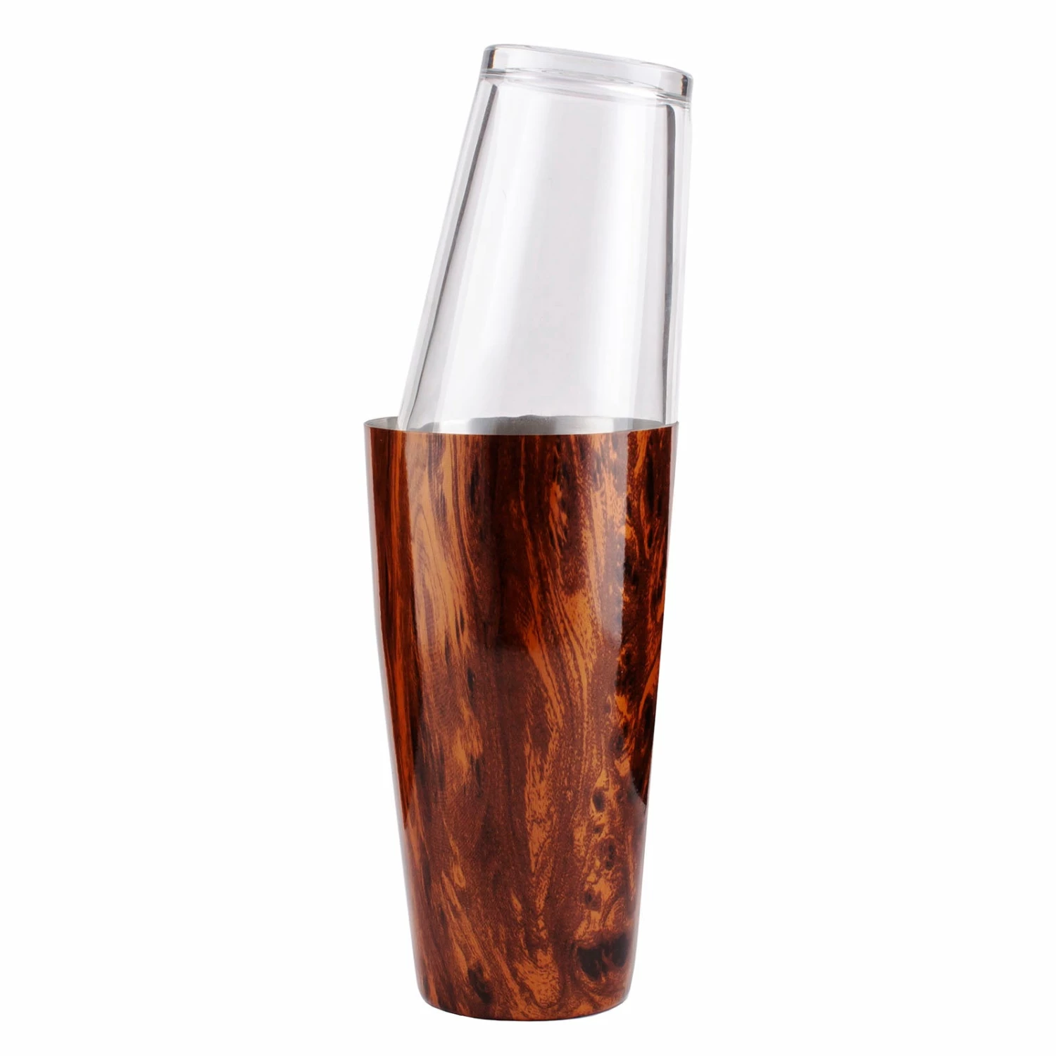 This wood grain design 2 piece shaker set will stand out in your collection of shakers. This shaker is made of stainless steel and has a painted rich dark wood grain pattern on the outside. It holds 25 ounces of liquid. It also comes with a clear 15 ounce pub glass. This durable combo cocktail bartending set is an excellent addition to your home bar, bars, and restaurants. Also makes a perfect gift for a bachelor, wedding, housewarming, or host gift. The wood grain shaker measures 6.75″ tall with a rim diameter of 3.5″. The pub glass measures 5.75″ with a rim diameter of 3.5″