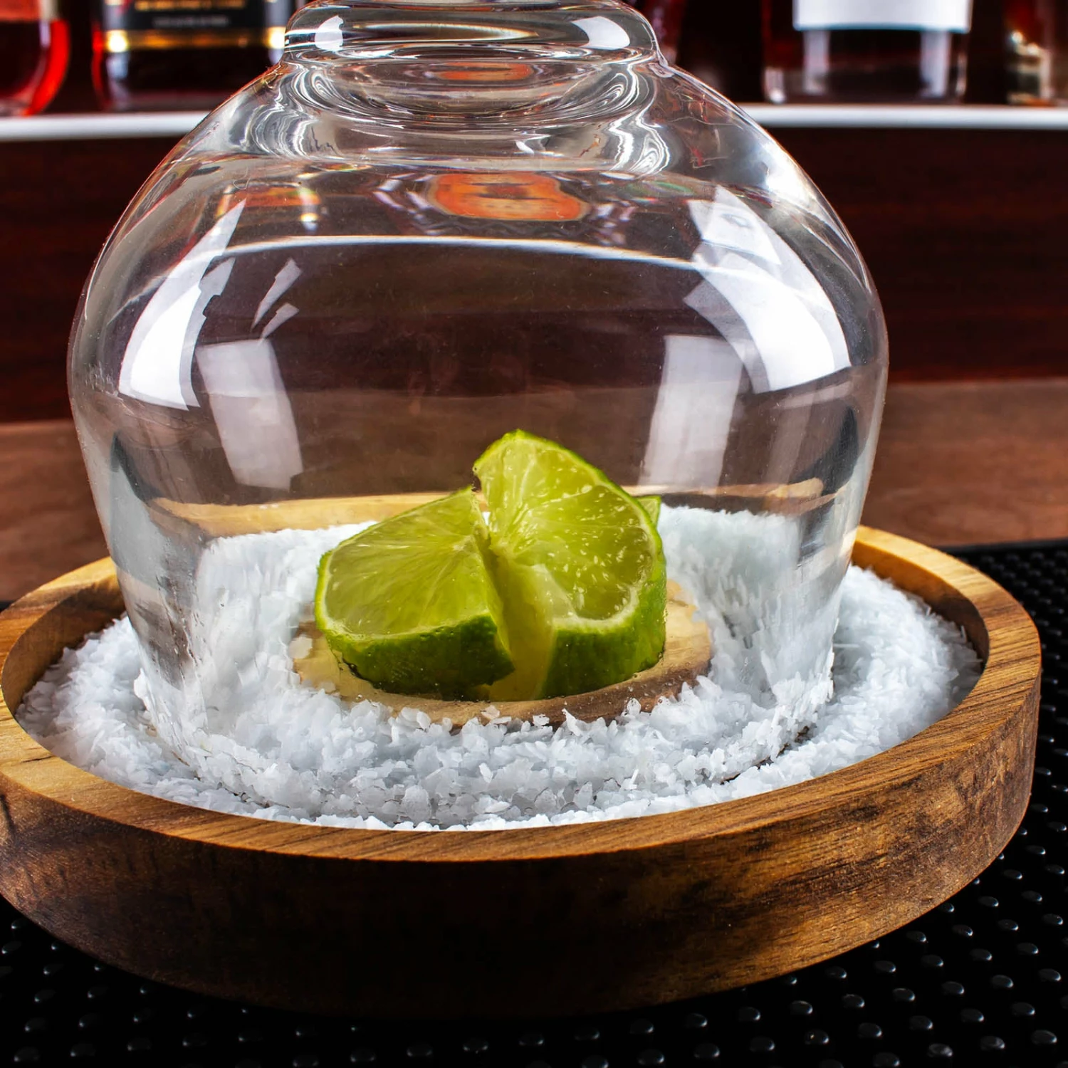 This beautiful salt rimmer is something that will stand out in your professional or home bar. It serves as a 3-in-1 tool that allows it to be used as a rimmer, salt storage, and a cutting board for limes. It is made out of durable wood. This rimmer is made extra large to handle traditional style margarita glasses. This product is hand wash recommended. To preserve the natural wood finish, periodically rub the wood with mineral oil. Measures 6 .25” dia. with 2″ in middle for holding limes.