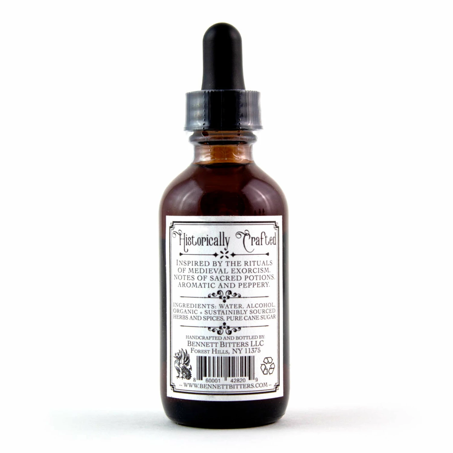 The Bennett Exorcism Bitters is inspired by the rituals of medieval exorcism, featuring notes of sacred potions that are aromatic and peppery, deep with molasses and delicate touches of stone fruit. Exotic cubed pepper greets the palate, soars on the wings of angelica root, and bursts into a floral bouquet. Exorcism Bitters will impart cocktails with warm, dark, and sensual notes that conjure thoughts of sacred potions.
