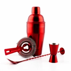Impress your friends and family with this candy apple red barware set. Complete with a cobbler style shaker, double jigger, hawthorne strainer, and spoon that doubles as a muddler. This stainless steel set includes everything you need to get started in making cocktails for your social gatherings. The metallic finish creates a unique looking set of bar tools than your usual silver finish. This item is great to give as a gift to bartenders or cocktail lovers in your life.