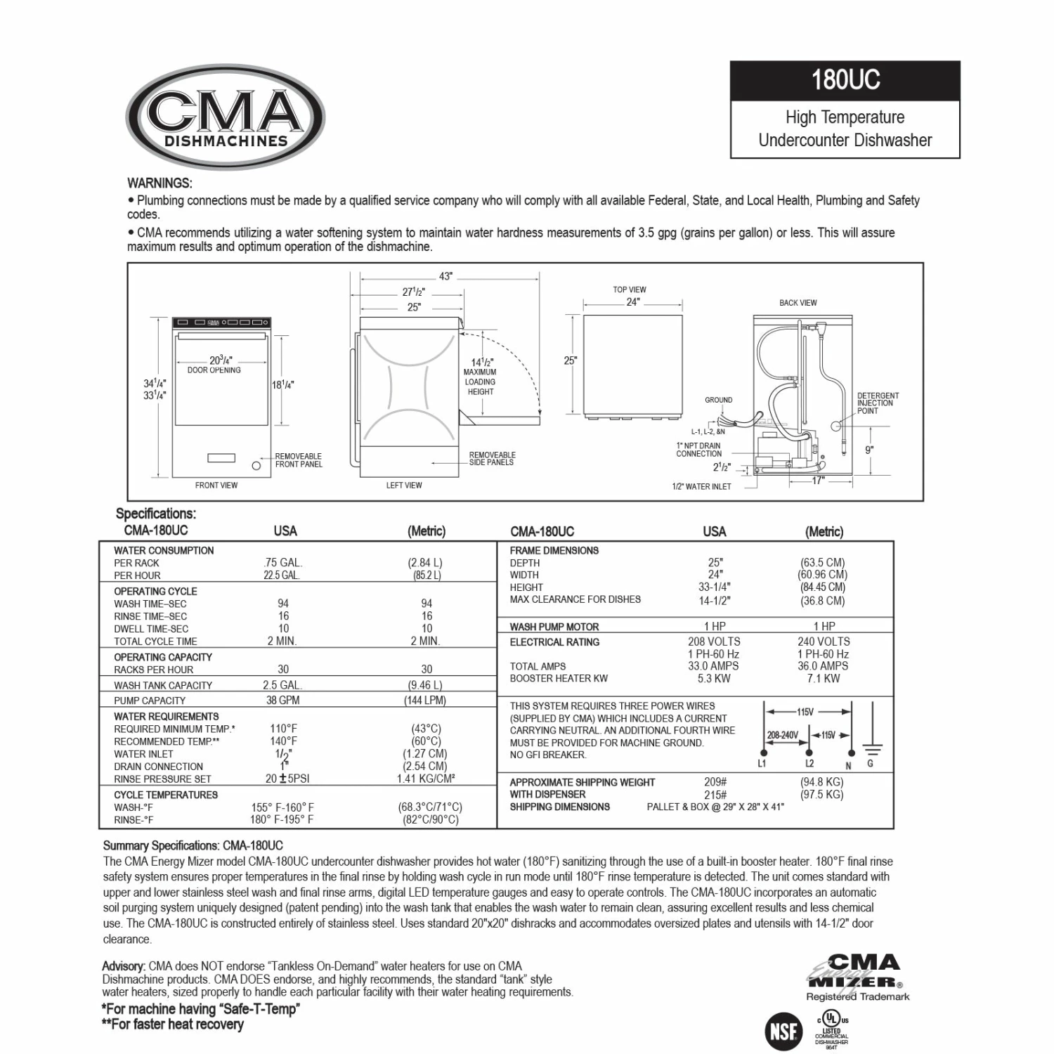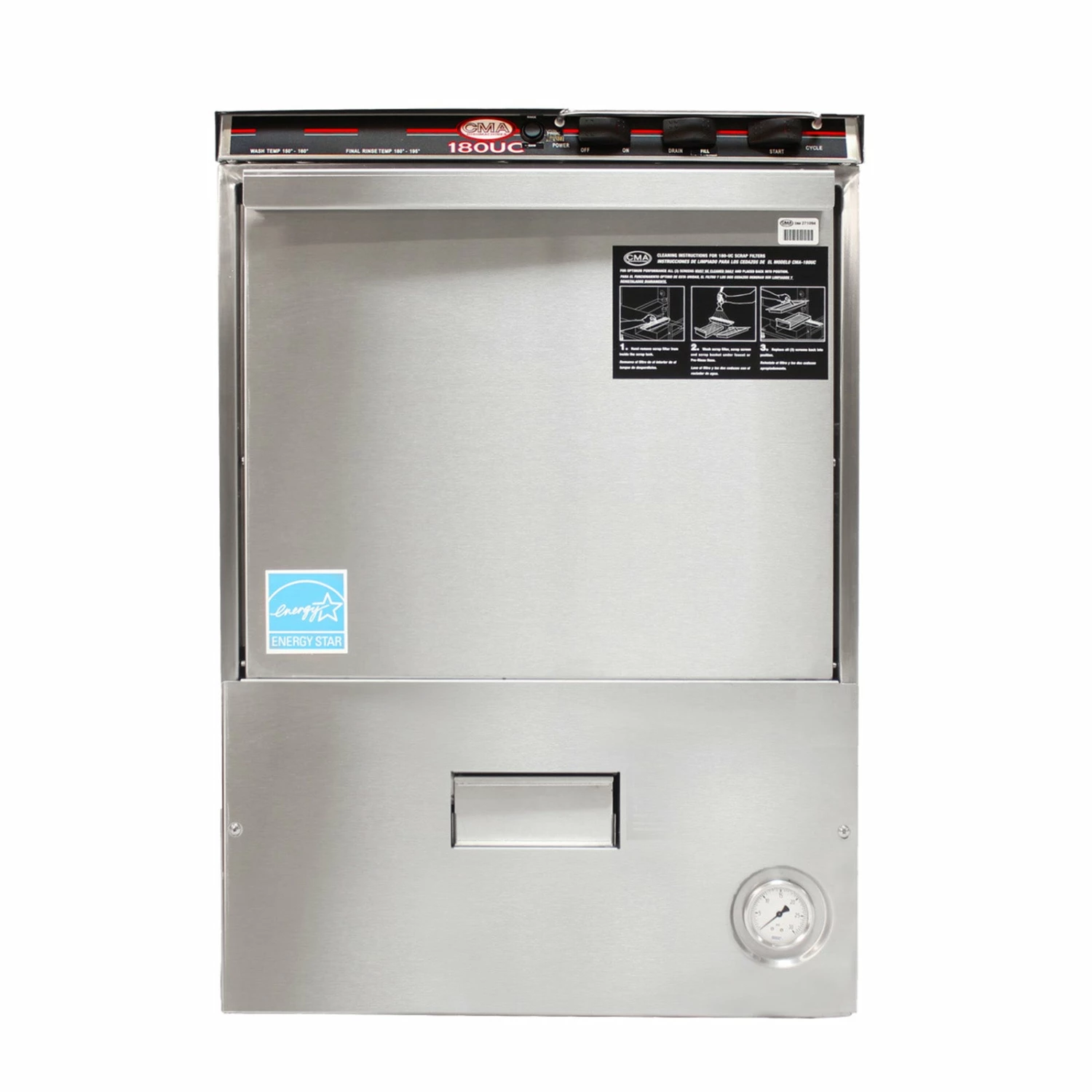 CMA High Temp Under Counter Growler & Bottle Washer. Does 30 racks/hour with 6kW booster heater and external scrap accumulator. Has 14 ½” maximum clearance for dishes, pump drain, and upper/lower stainless steel rotating wash and rinse arms. Unique design requires no exposed wash tank heating element. Safe-T-Temp feature assures a 180°F final rinse, built in chemical pumps and delime switch. Factory installed detergent & rinse pump, deliming system, external Poly Pro™ scrap accumulator,stainless steel rotating wash & rinse arms, LED temp display, stainless steel construction, for use with 20″ x 20″ dish racks, includes (1) open & (1) peg rack, 1 HP wash pump, NSF, cULus, ENERGY STAR®. 208v/60/1-ph, 33.0 amps, with 5.3 kW booster heater. Measures 24″W x 25″D x 33 ¼”H. The 180UC machine can be converted from dish washing to bottle washing in just a few minutes.