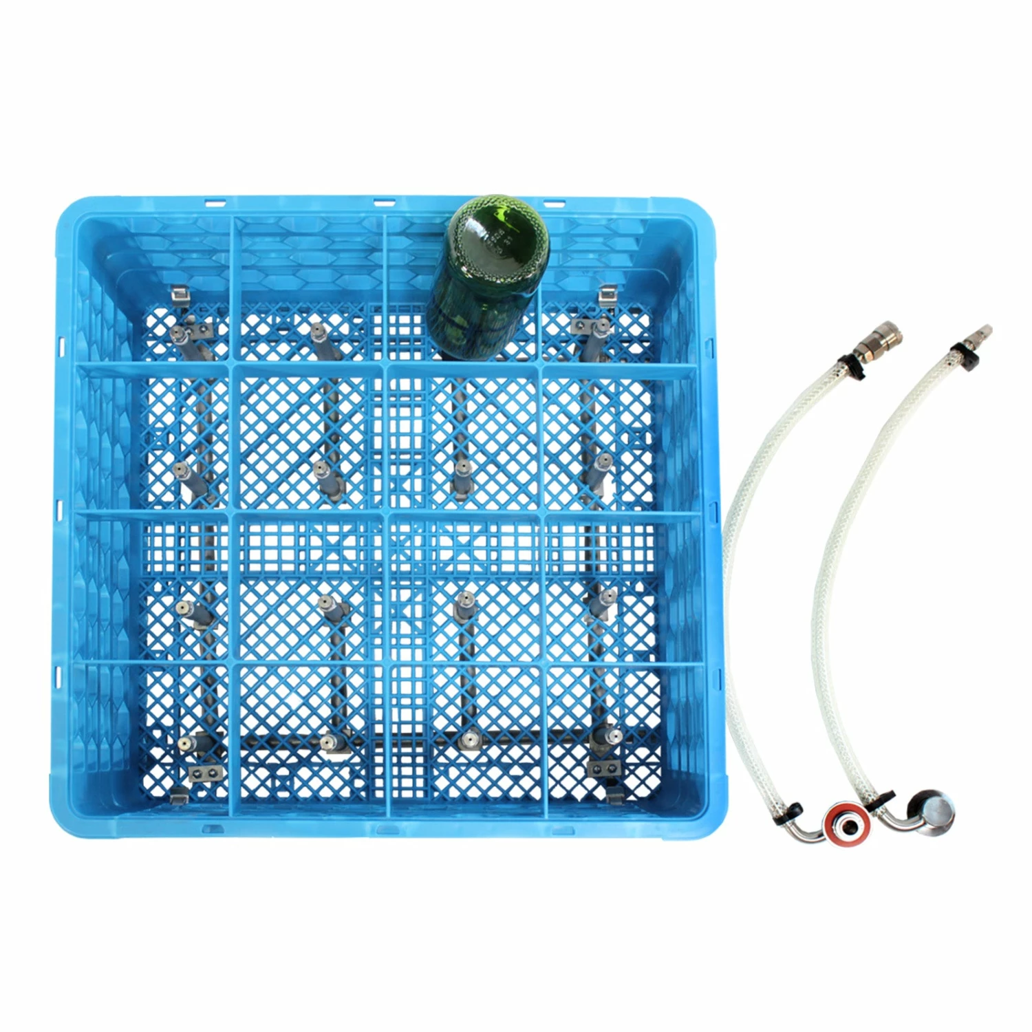 The (9) Compartment Hi-Temp Sanitizing Bottle Washer Rack is great for washing and sanitizing all shapes and sizes of bottles. This concept is ideal for “Growler Bottles” for Micro Breweries. The racks are fitted with a spray manifold system that places a strategically positioned spray jet inside the neck of each bottle. The Bottle Washer Rack comes with wash and rinse adapters that replace the lower wash/rinse arms. The adapters are fitted with hoses that quickly connect & disconnect to the side of the Bottle Washer Rack for easy and fast removal of the rack.