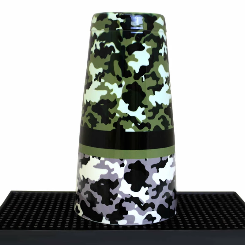 From the company who has brought you these popular shakers in an array of colors and textures, we are extremely excited to be able to offer you these custom printed shaker tin designs. Exclusive to BarProducts.com, you will not be able to find these babies anywhere else. Still maintaining the professional features of the standard shaker, we added a colorful, cool and fun element to it. Stand out among other bartenders and sport this 2 tone Camo shaker tin design!