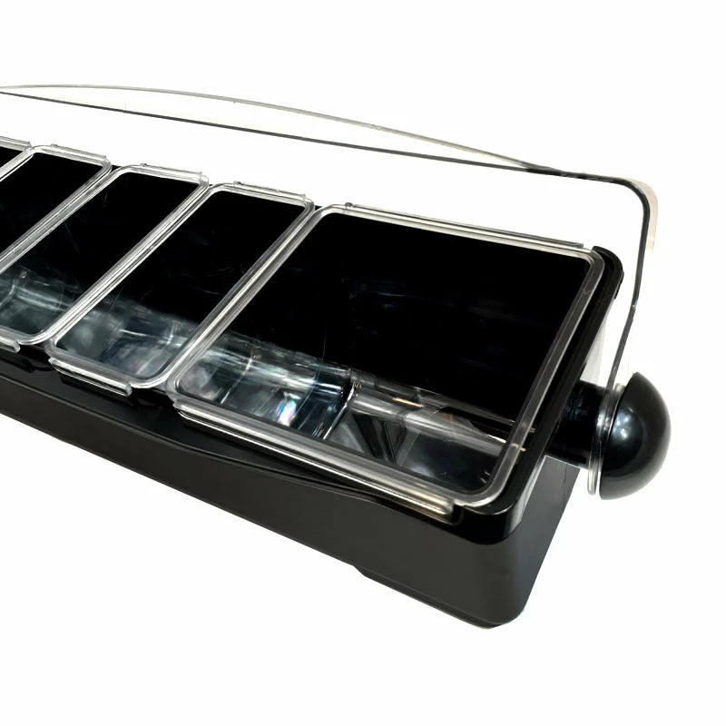 Black plastic bar condiment holder comes with a (2-Quart) and four (1-Quart), hard plastic inserts and has a clear dome shaped lid to see what you need to grab with only a simple glance. The removable inserts allow you to customize your condiment holder to accommodate different garnishes for faster service to your customers. Having the lid can be very useful when storing your garnishes in a fridge or cooler at the end of the night. Easy to use and keep clean. Measures 17 1/2″ L x 7″ H.
