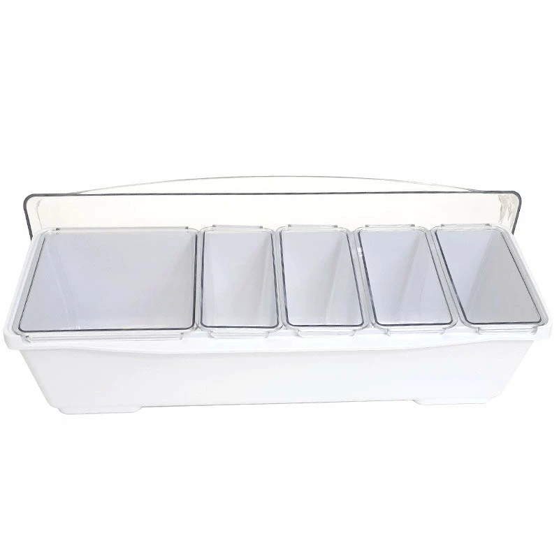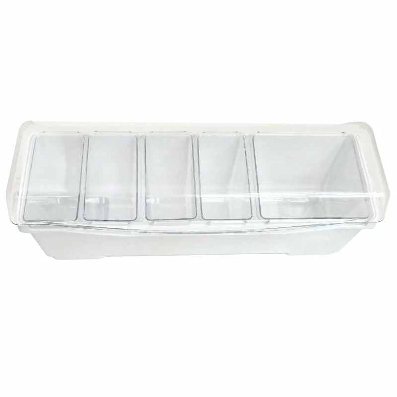 White plastic bar condiment holder comes with a (2-Quart) and four (1-Quart), hard plastic inserts and has a clear dome shaped lid to see what you need to grab with only a simple glance. The removable inserts allow you to customize your condiment holder to accommodate different garnishes for faster service to your customers. Having the lid can be very useful when storing your garnishes in a fridge or cooler at the end of the night. Easy to use and keep clean. Measures 17 1/2″ L x 7″ H.