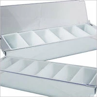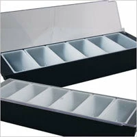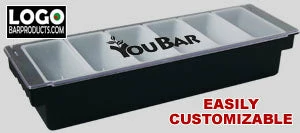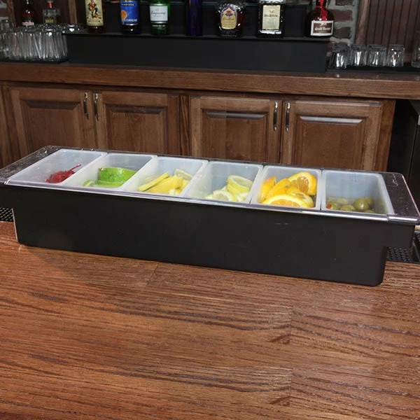 Designed much like our other standard Fruit Trays, this 6 pint Condiment Holder features a flat, smooth plastic top (lid). The flat top can be very useful when storing your garnishes in a fridge or cooler at the end of the night, allowing you to sturdily stack other flat-bottomed items on top of it, therefore preserving more space. The flat top of this garnish center is also ideal for customization with a screen printed logo. Available in satin black, chrome, satin red, and satin blue. Features 6 pint compartments and measures 19″L x 3.5″H x 6″W.