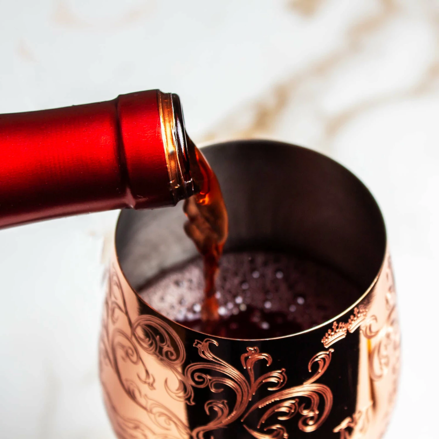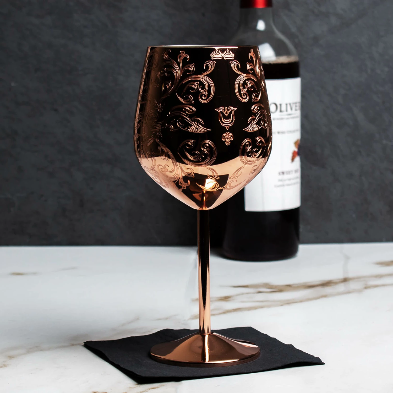 - Has vintage style etched deign that wraps around the wine glass