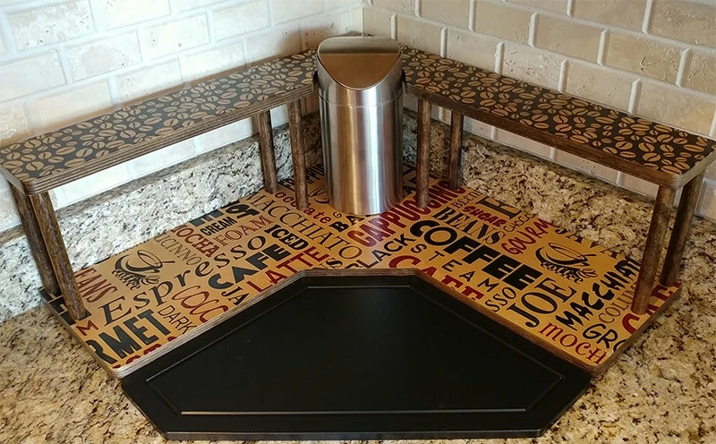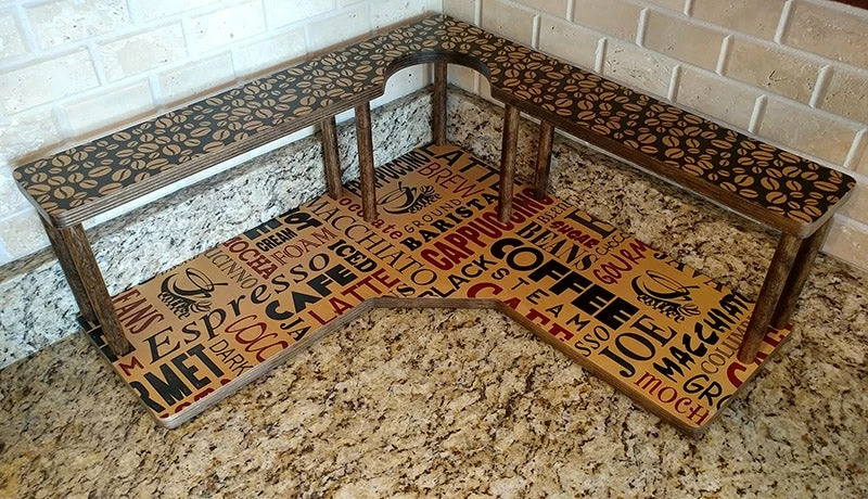 This particular shelf features a trendy coffee collage design imprint along with a smooth stained finish that easily wipes clean. They are also sold with rubber feet on the bottom, giving the shelf a bit of a raise from your counter while protecting it from scratches and bacteria build-up.