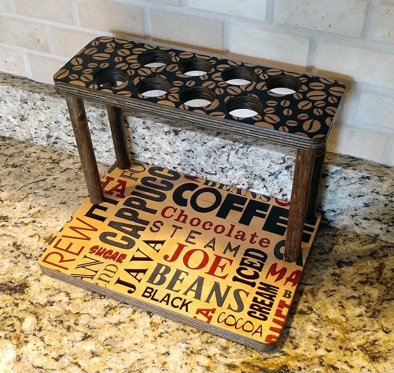 These 2-tier birch wood shelves are designed to fit perfectly in the corner, on the counter underneath your cabinets. The tall dowel rods lift the 2nd shelf up 7″ above the 1st shelf, allowing the perfect amount of space on the bottom and top tiers to hold your Barista-related supplies such as mugs, sugars, creamers, and other condiments. The upper shelf features 8 1.5″ diameter slots to neatly stock up on your K-Cups!