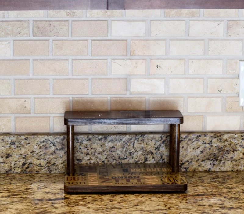 These 2-tier shelves are designed to fit perfectly underneath your kitchen cabinets, while still being able to easily access common spices and ingredients. They are handcrafted in the USA, right here in our very own bar products woodshop. Our counter caddy shelves are constructed from durable baltic birch wood, with 4 secure dowel rods. The culinary collage finish is easy to clean and each shelf is sold with rubber feet on the bottom, giving the bottom shelf a bit of space from your counter to help protect it from scratches and bacteria build-up.