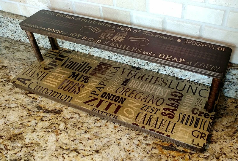 These 2-tier shelves are designed to fit perfectly underneath your kitchen cabinets, while still being able to easily access common spices and ingredients. They are handcrafted in the USA, right here in our very own bar products woodshop. Our counter caddy shelves are constructed from durable baltic birch wood, with 4 secure dowel rods. The culinary collage finish is easy to clean and each shelf is sold with rubber feet on the bottom, giving the bottom shelf a bit of space from your counter to help protect it from scratches and bacteria build-up.