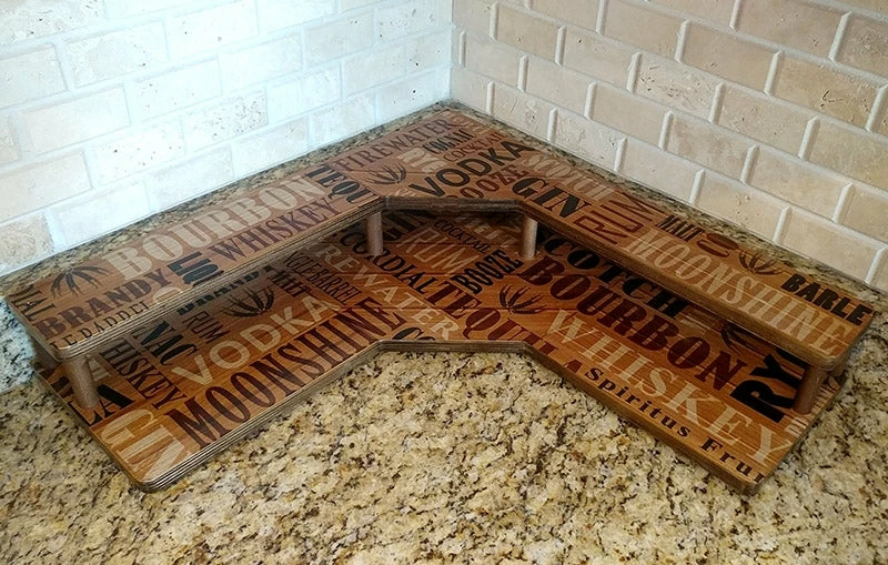 Our trademarked Counter Caddies™ in “LIQUOR” themed artwork is designed to accommodate the home bar enthusiast who has limited bar space. Set up your home bar area in a convenient location on your kitchen counter. These shelves look fantastic displaying your favorite liquor brands as well as the bar tools needed to concoct your amazing signature cocktails. Set them up however you like and have quick and easy access when it’s time to entertain friends, family, and guests!