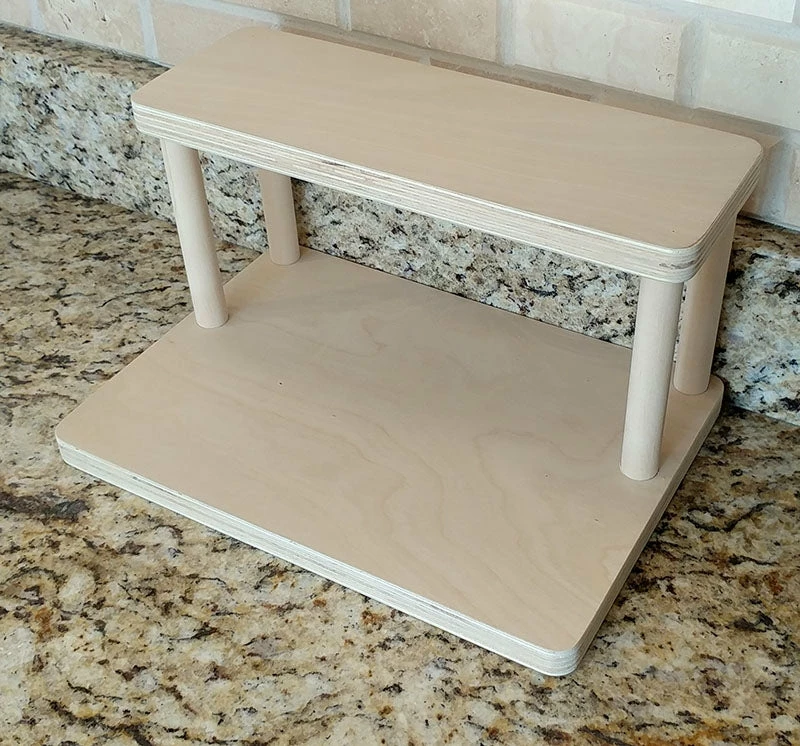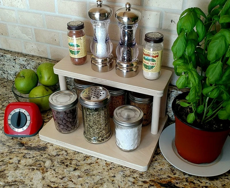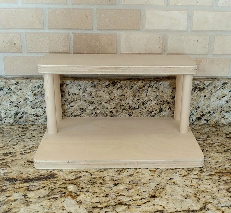 These 2 tier shelves are designed to fit perfectly on your counter underneath your cabinets, while still being able to easily access common spices and other ingredients. They are handcrafted in the USA, right here in our very own BPC woodshop. Counter Caddy Straight Shelves are constructed from a durable wood material with 4 secure 5.75″H dowel rods. This particular shelf features a smooth natural finish that allows you to keep that natural look OR apply a stain/paint that perfectly matches your kitchen theme! They are also sold with rubber feet on the bottom, giving the shelf a bit of a raise from your counter while protecting it from scratches and bacteria build up.