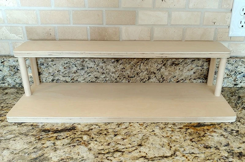 These 2 tier shelves are designed to fit perfectly on your counter underneath your cabinets, while still being able to easily access common spices and other ingredients. They are handcrafted in the USA, right here in our very own BPC woodshop. Counter Caddy Straight Shelves are constructed from a durable wood material with 4 secure 5.75″H dowel rods. This particular shelf features a smooth natural finish that allows you to keep that natural look OR apply a stain/paint that perfectly matches your kitchen theme! They are also sold with rubber feet on the bottom, giving the shelf a bit of a raise from your counter while protecting it from scratches and bacteria build up.