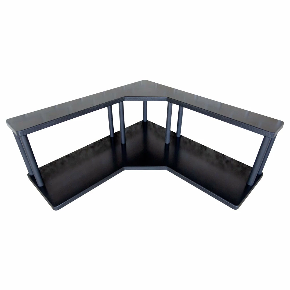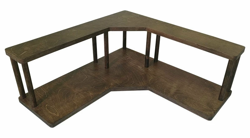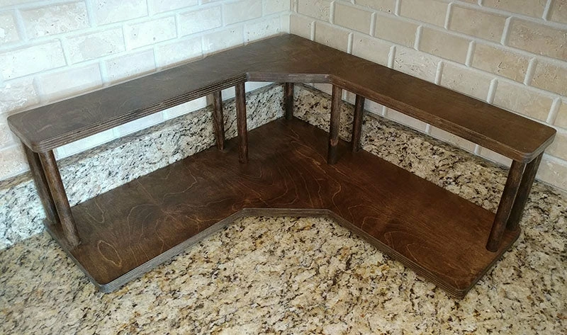 These 2-tier wood shelves are made out of baltic birch and designed to fit perfectly in the corner on the counter underneath your cabinets. The tall dowel rods lift the 2nd shelf up 7″ above the 1st shelf, allowing the perfect amount of space to hold your coffee-related supplies such as sugars, creamers, and other condiments.