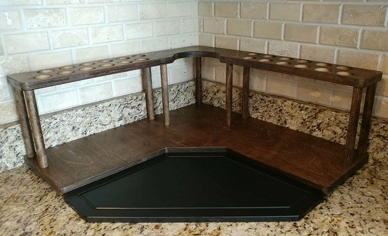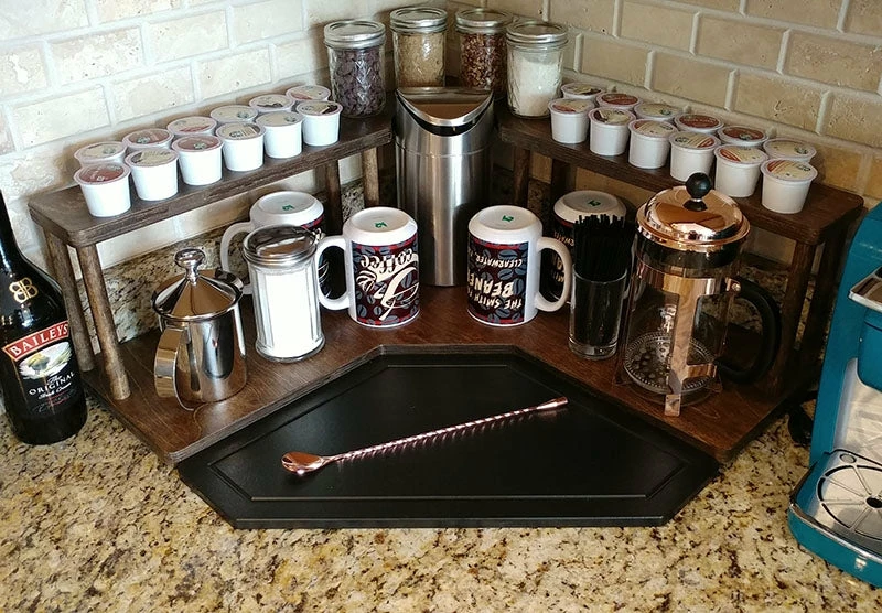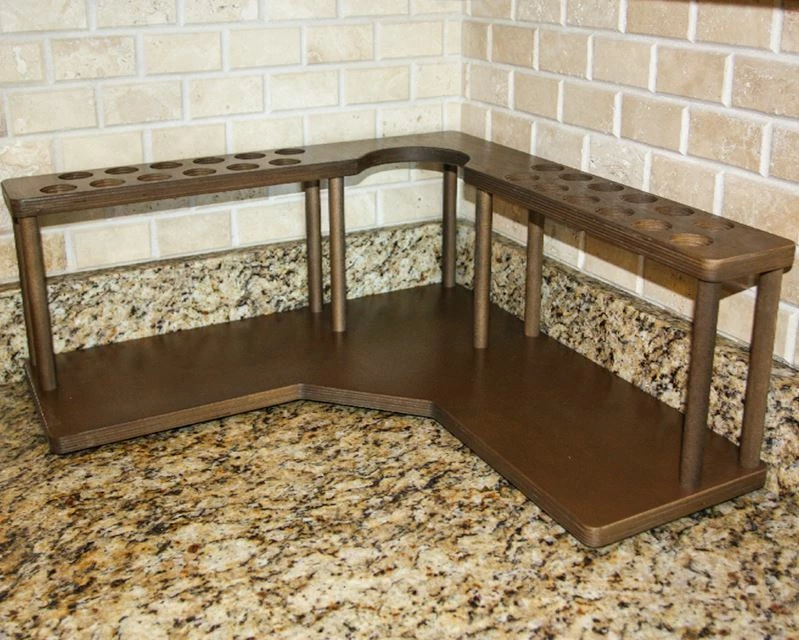These 2-tier wood shelves are made out of baltic birch and designed to fit perfectly in the corner on the counter underneath your cabinets. The tall dowel rods lift the 2nd shelf up 7″ above the 1st shelf, allowing the perfect amount of space to hold your coffee-related supplies such as sugars, creamers, and other condiments. The smooth finish is easy to clean. This shelf also has rubber feet on the bottom, giving the bottom shelf a bit of space from your counter to help protect it from scratches and bacteria build-up. The top tier features 24 1.5″ diameter slots to perfectly stock your K-Cups and an inset for a 4.5″ diameter trash can.