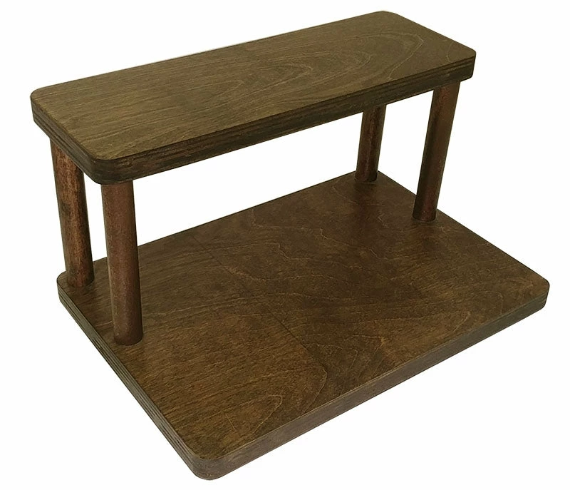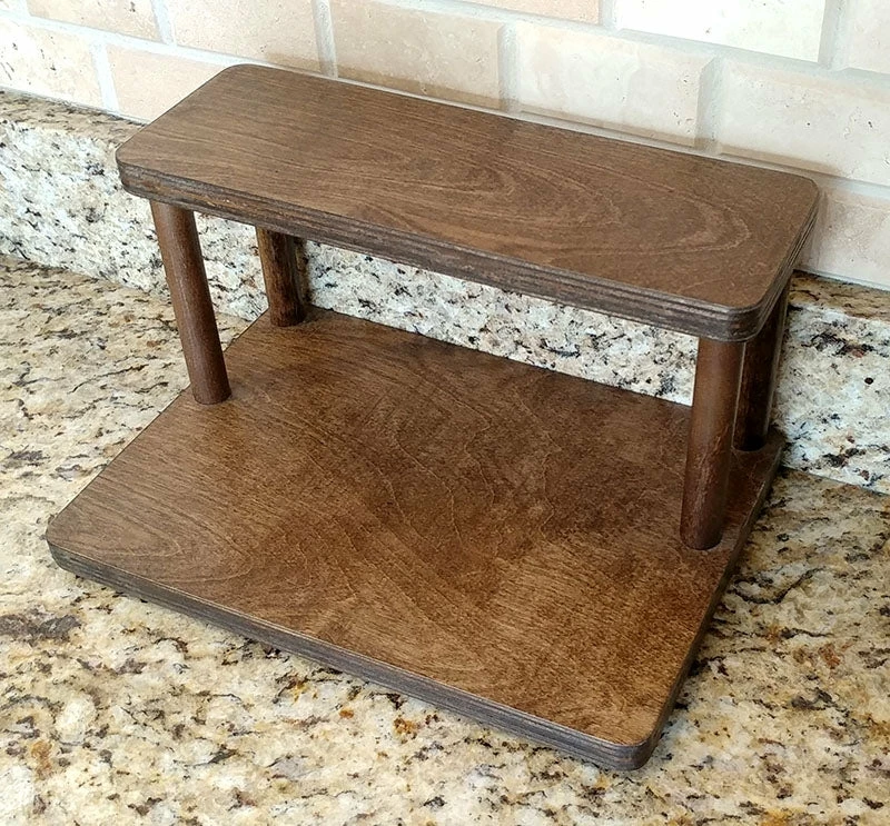 These 2-tier shelves are designed to fit perfectly underneath your kitchen cabinets, while still being able to easily access common spices and ingredients. They are handcrafted in the USA, right here in our very own BPC woodshop. Our counter caddy shelves are constructed from durable baltic birch wood, with 4 secure 5.75″H dowel rods. The stained finish is easy to clean and each shelf is sold with rubber feet on the bottom, giving the bottom shelf a bit of space from your counter to help protect it from scratches and bacteria build-up.